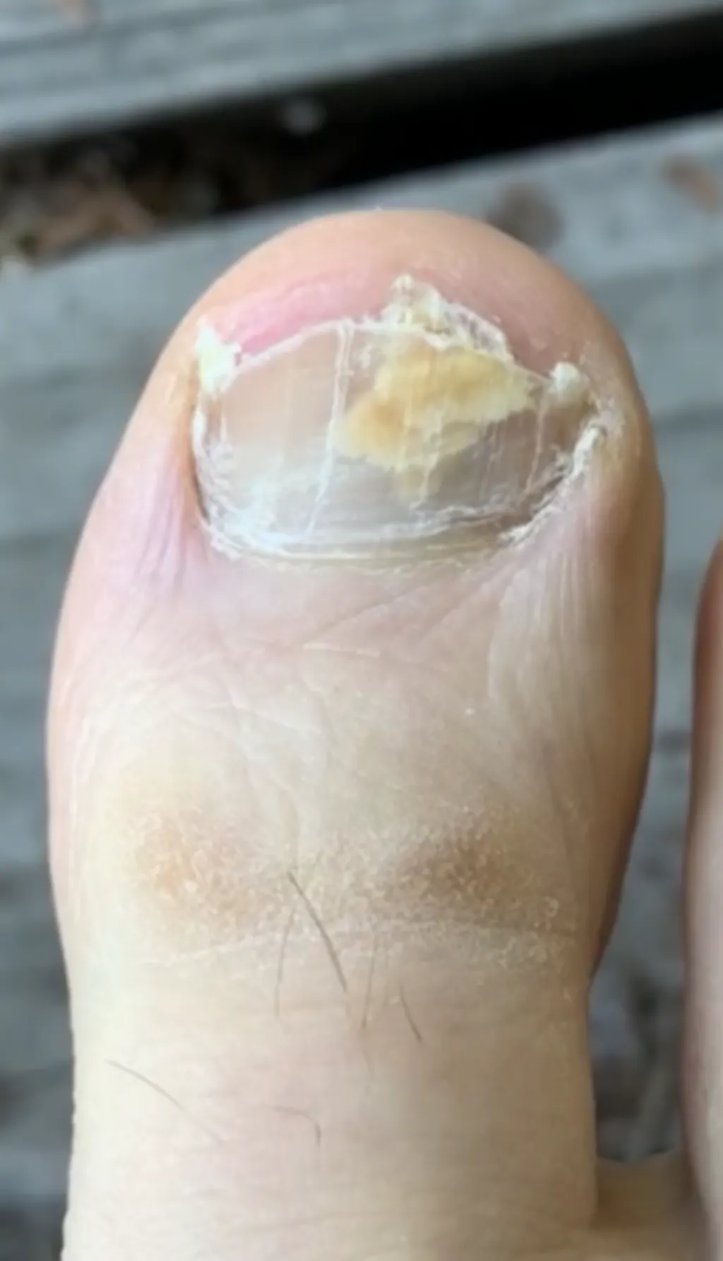 Der extrem rissige Nagel ist innerhalb weniger Monate mit Hilfe unseres Nagelpflegestifts rausgewachsen.